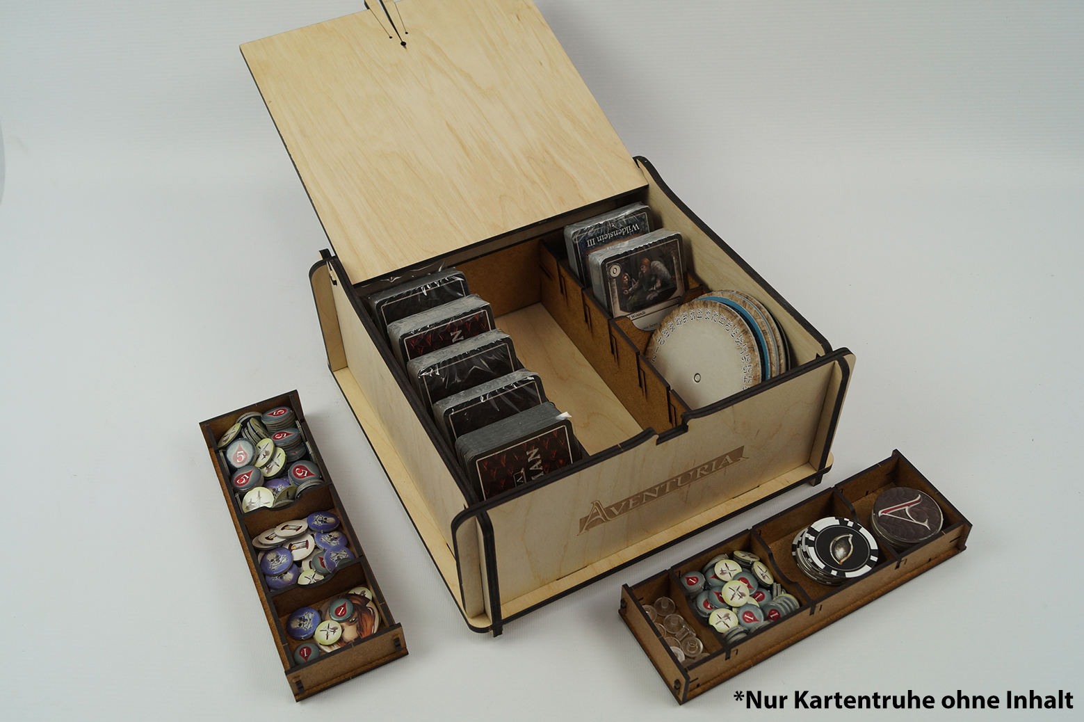The card chest offers you space for around 750 cards (or 450 with the marker insert). In the middle of the box you can insert several removable compartments for markers instead of the card dividers. The box is made of laser-cut wood and features the Armory of the Warring Kingdoms motif on the top flap and the Aventuria and The Dark Eye logos on the sides. The perfect addition to your Aventuria and DSA5 card collection!